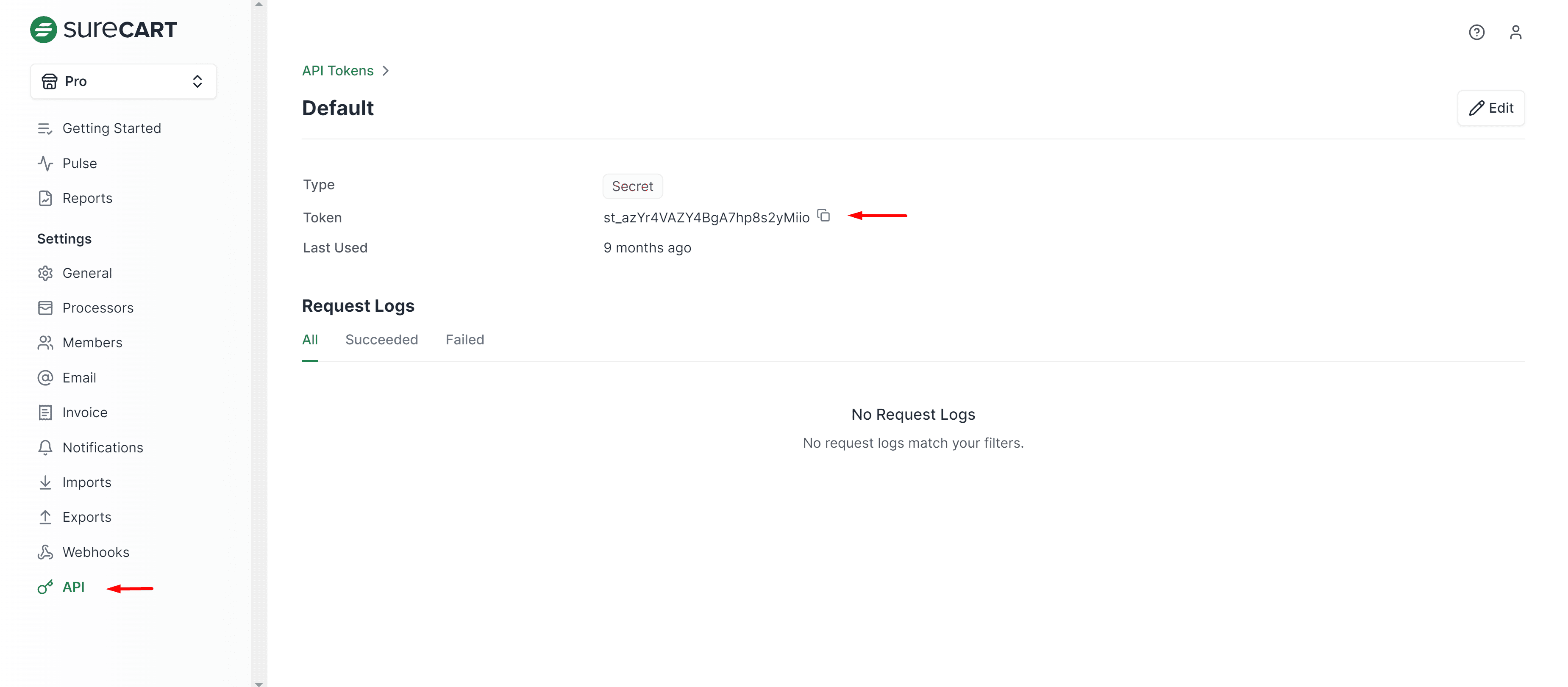 - Copy the API token from your SureCart dashboard app.surecart.com > API > Secret Token. Ensure you are using the correct store API key if you have multiple stores.