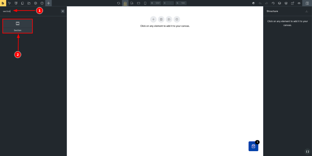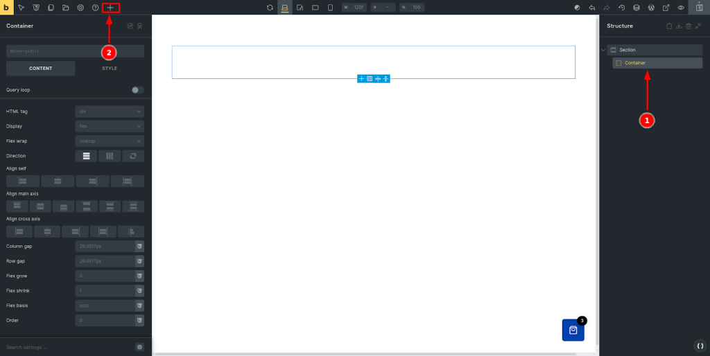 - Click on the Elements button (2) to add a SureCart Element to the container.