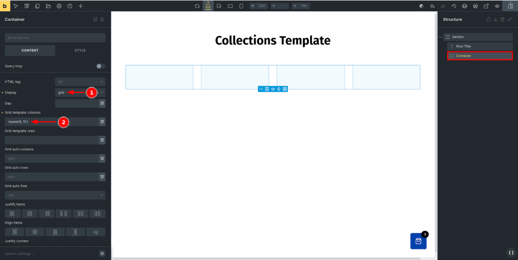 - In the Grid Template Columns, type repeat(4, 1fr) to create 4 columns (2).