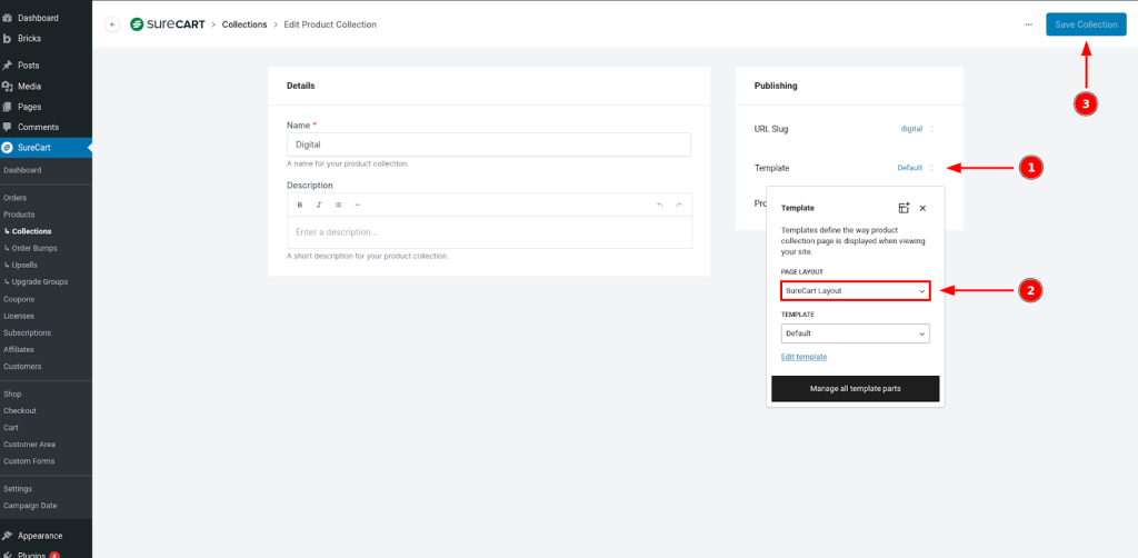 - In the Template type dropdown, select SureCart – Collection Archive (2).