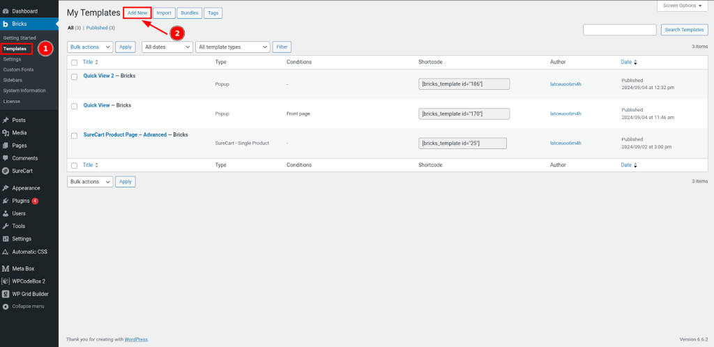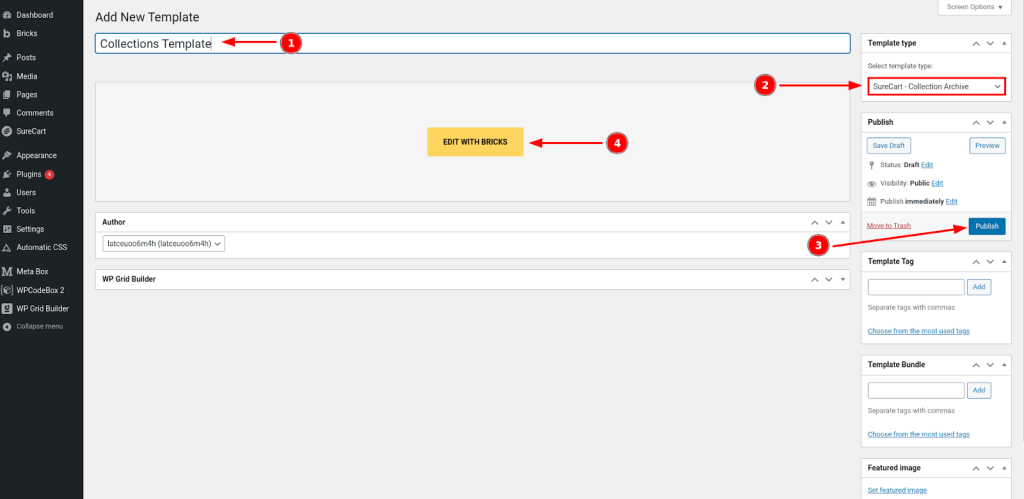 - Then click the Edit with Bricks button (4) to start designing your template.