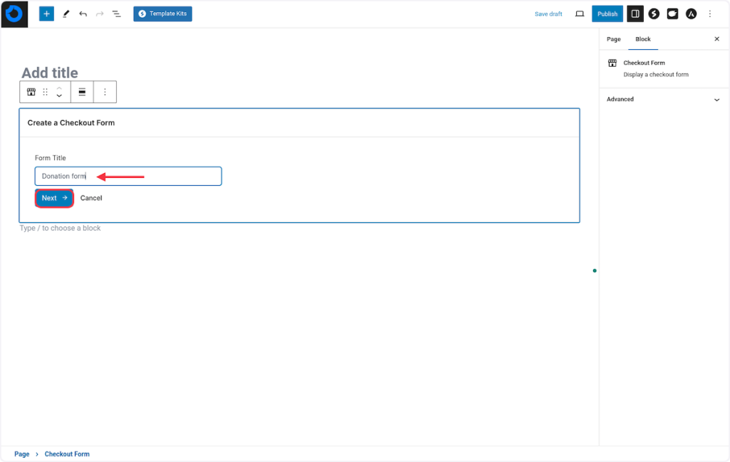 - Type your form name, in our example “Donation form” then click on the “Next” button to proceed.