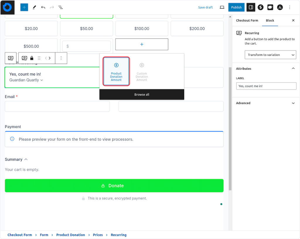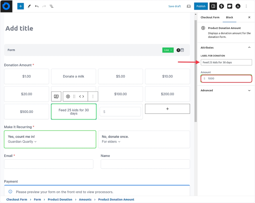 - To alter the amount, you can do so within the right-side panel under the Amount field of the Product Donation Amount block.