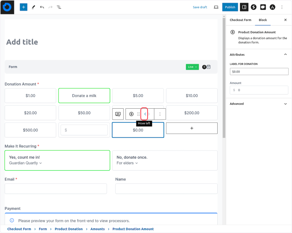 - Click on the left arrow to move the Product Donation Amount block to the left