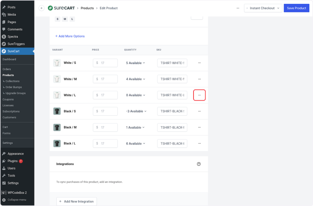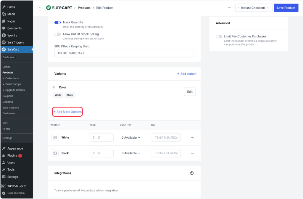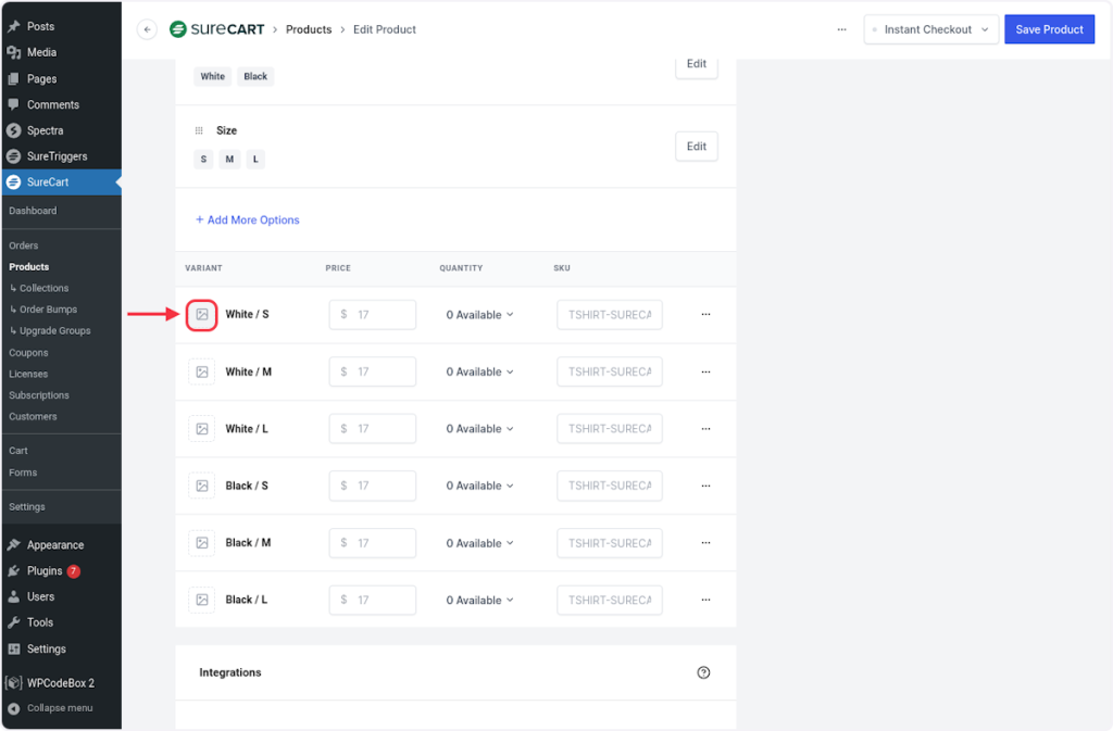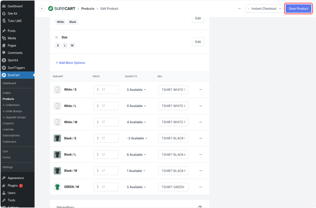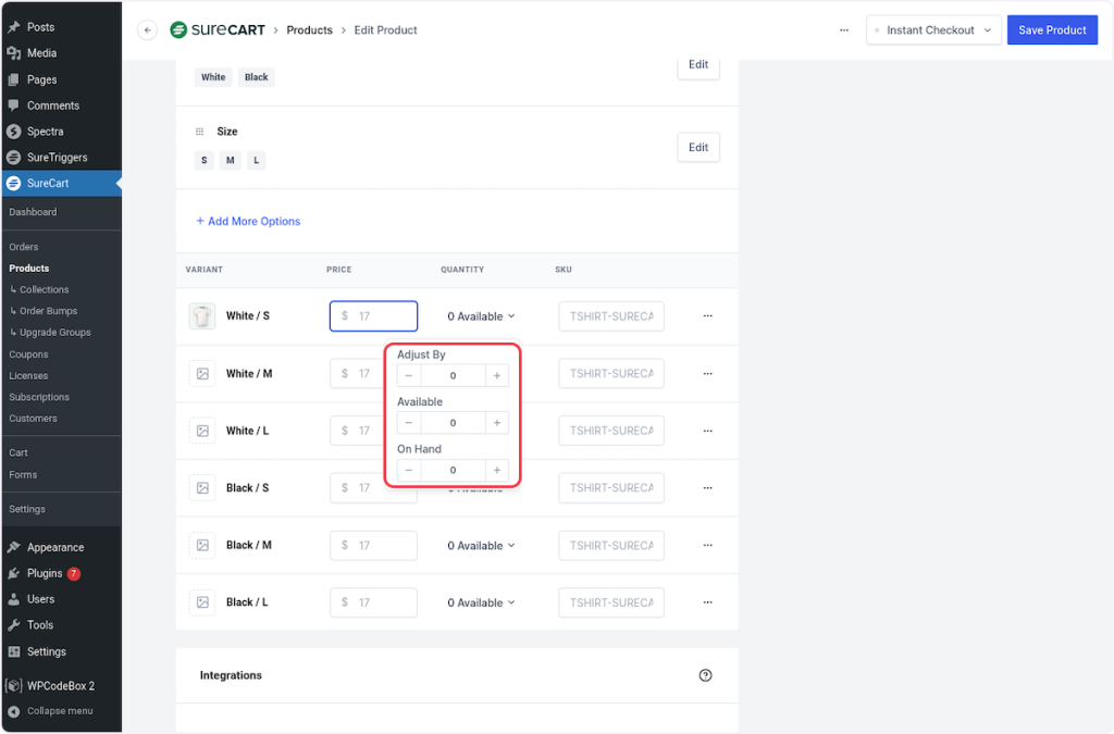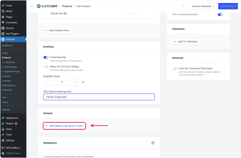 When you work with variations, SureCart has two sections: Inventory and Variants on the Edit Product page. We’ll explain these sections in detail.