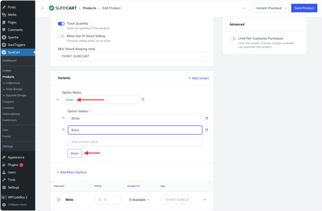 Please note: “Option Name” and “Option Values” are not internal names; they will also be visible on the front end, so ensure you use descriptive names. - Once you are satisfied with this variant, click on the “Done” button.