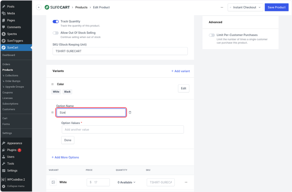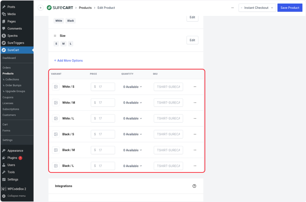 SureCart supports up to 300 variations per product. However, adding a large number of variations (for example, more than 200) may lead to PHP memory or performance issues on some hosting environments.