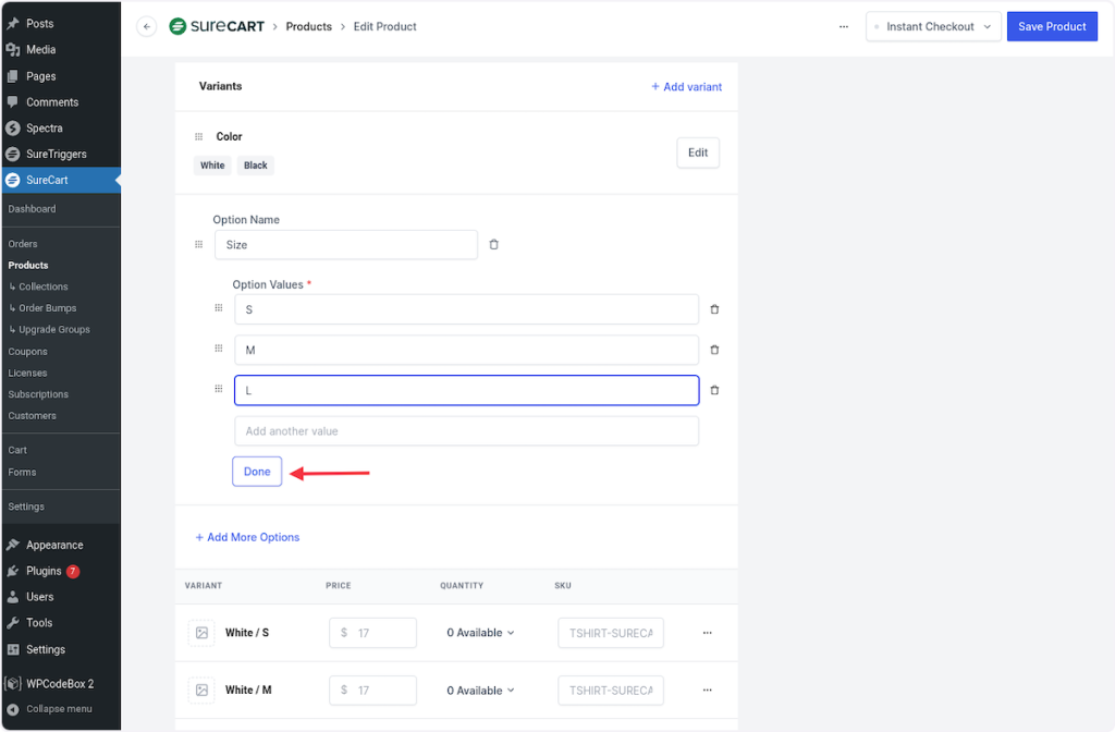 - Add all the options for the sizes you need. In our example, we added only sizes S, M, L, which represent Small, Medium, and Large. Click the “Done” button to confirm the values.