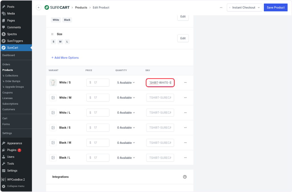 - Lastly, add a SKU for each variant. In our example, we used “TSHIRT-WHITE-S” as the SKU for the White / Small variant.