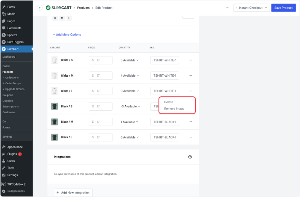 - To delete a specific variant, click on the three-dot menu associated with the variant you wish to remove.