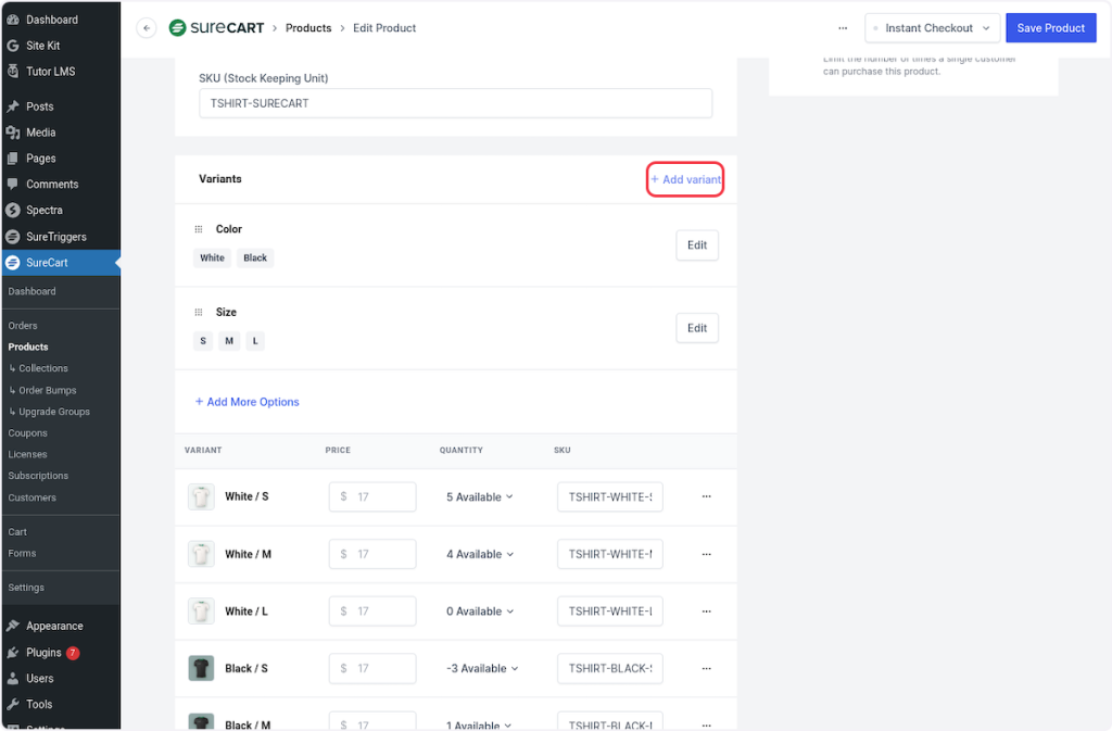 - To add a specific variant, click on the “Add Variant” button located at the top right of the Variants section.