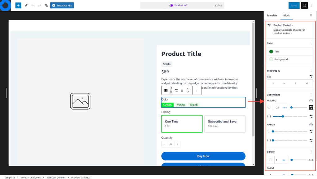 - In the Edit Product screen, navigate to Edit template and click on the Product Variants block.
