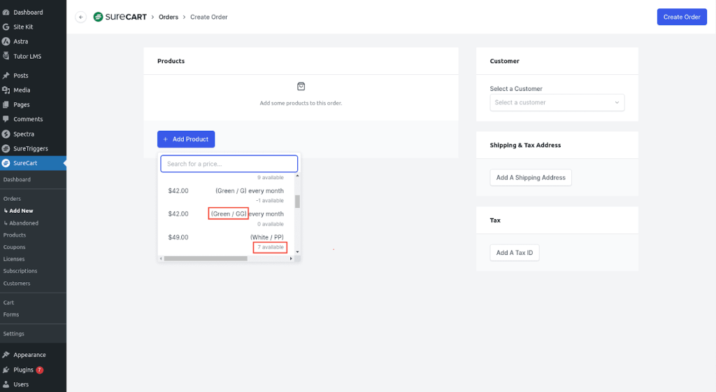 Creating a manual order with product variants follows a process similar to that of non-variant products. The primary distinction lies in variant products displaying the stock quantity and the variant name, as you can see from the screenshot below.