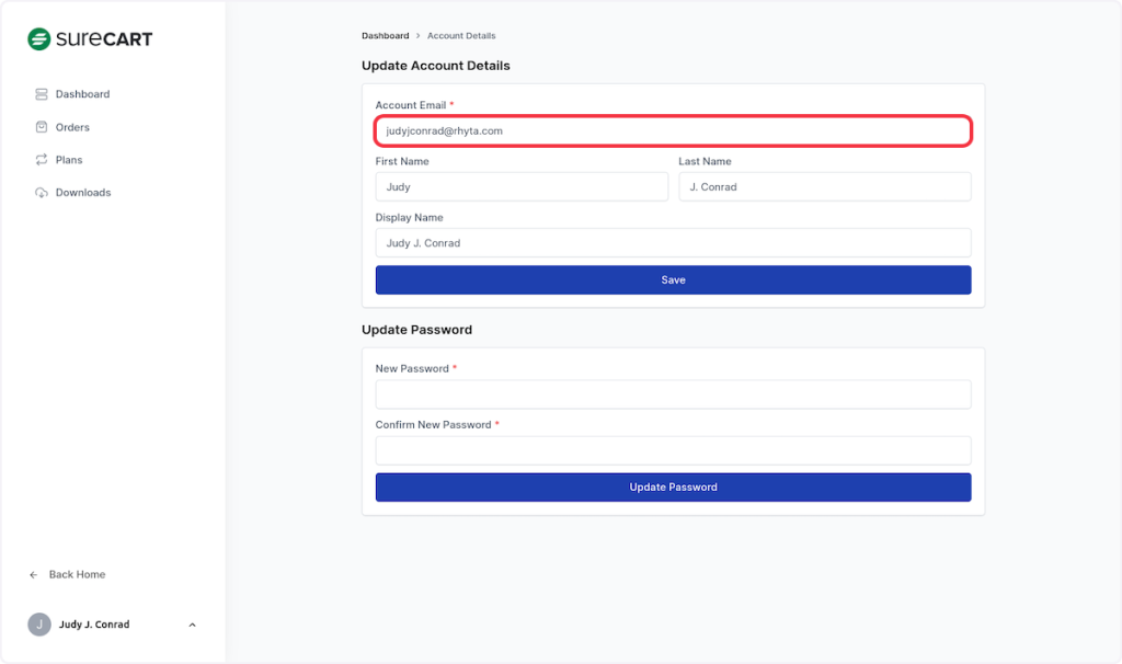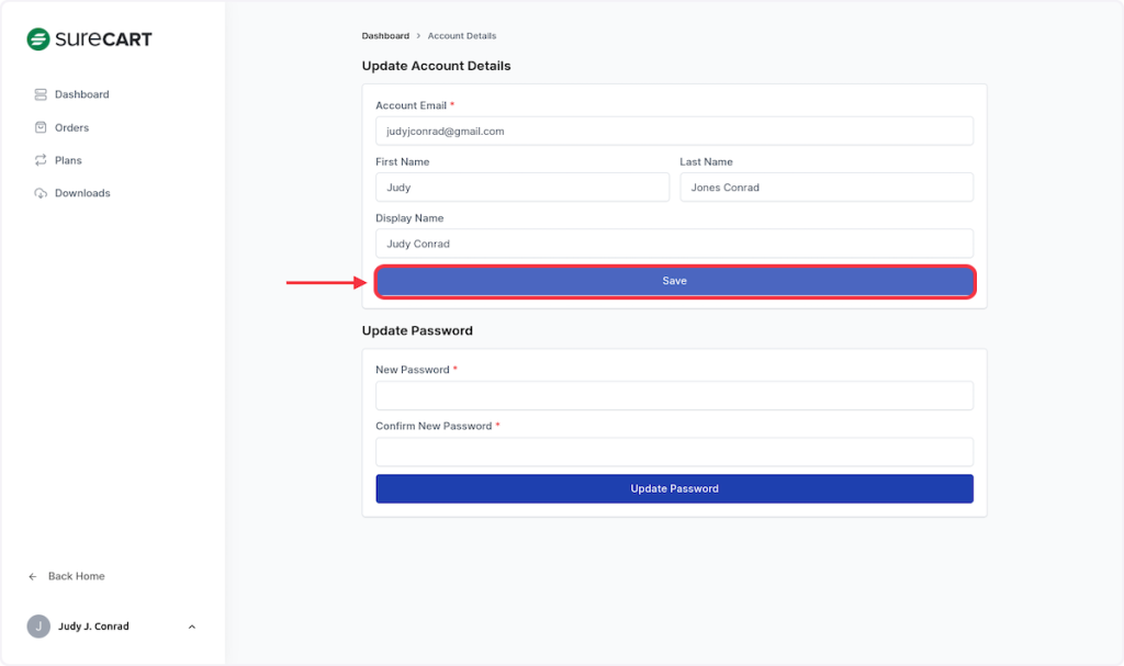 In this article, we’ll walk you through the steps of how your customers can update their account details such as their email, first name, last name, and display name from their customer dashboard.