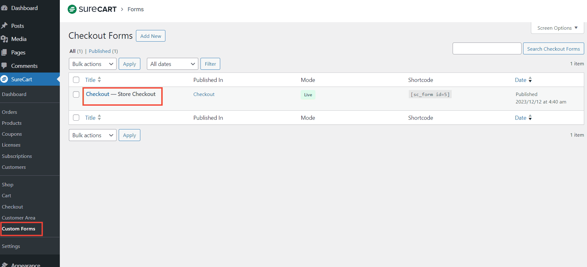 - In your WordPress dashboard navigate to Custom Forms. Select the form where you want to enable express payments. Here we are adding express to our checkout form.