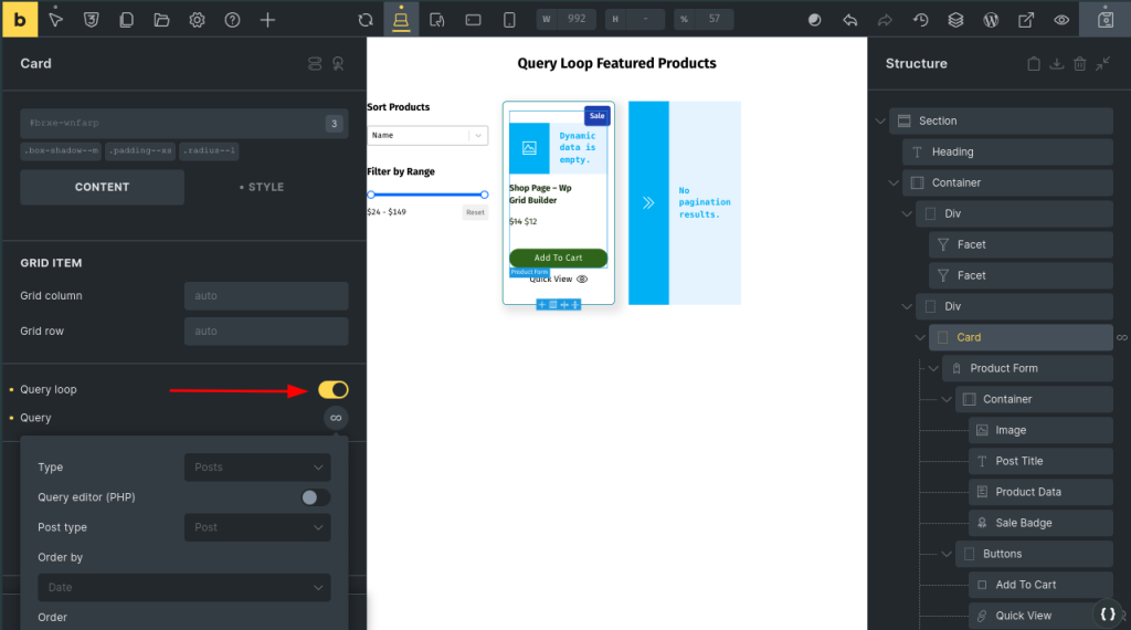 - In your Bricks Builder editor, toggle on “Query loop.” This will allow you to filter your product posts.