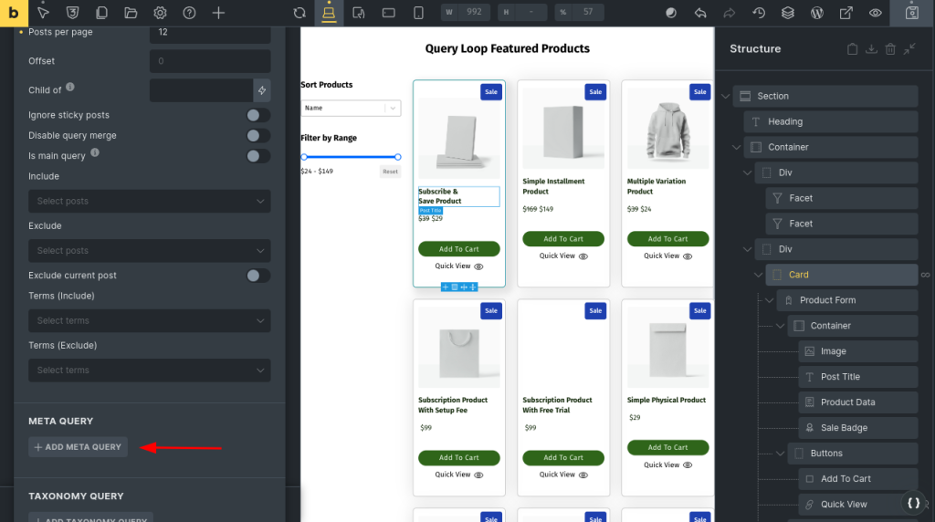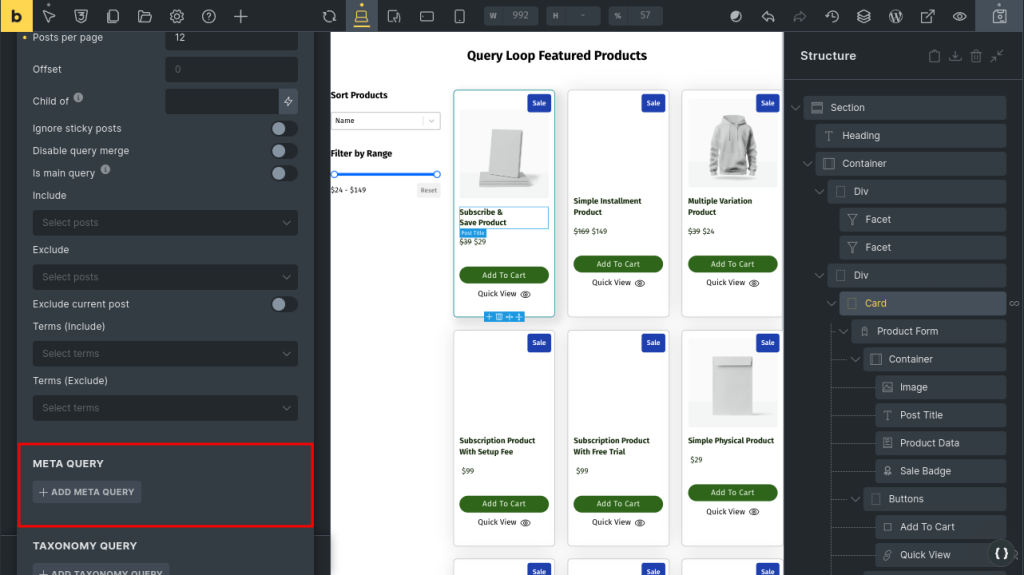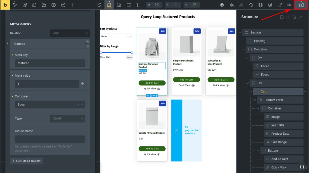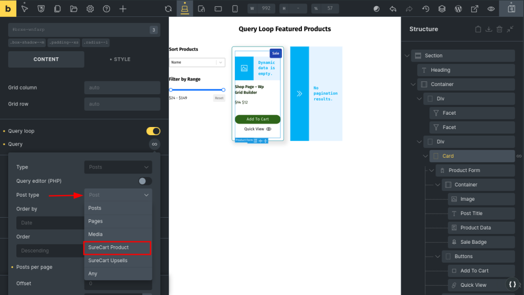 That’s it! You now have a custom query loop in Bricks Builder that filters and displays only your featured SureCart products.