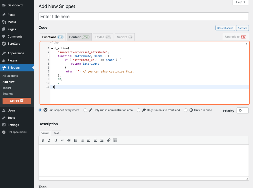 - Paste the copied code snippet in this box. You can also give a title and description for this snippet here.