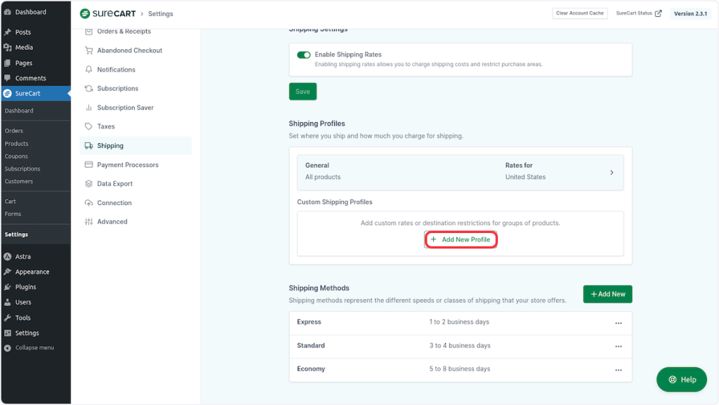 By default, SureCart provides a General profile, but you might have specific shipping requirements or want to offer different methods for certain products. That’s where creating additional profiles comes in handy.