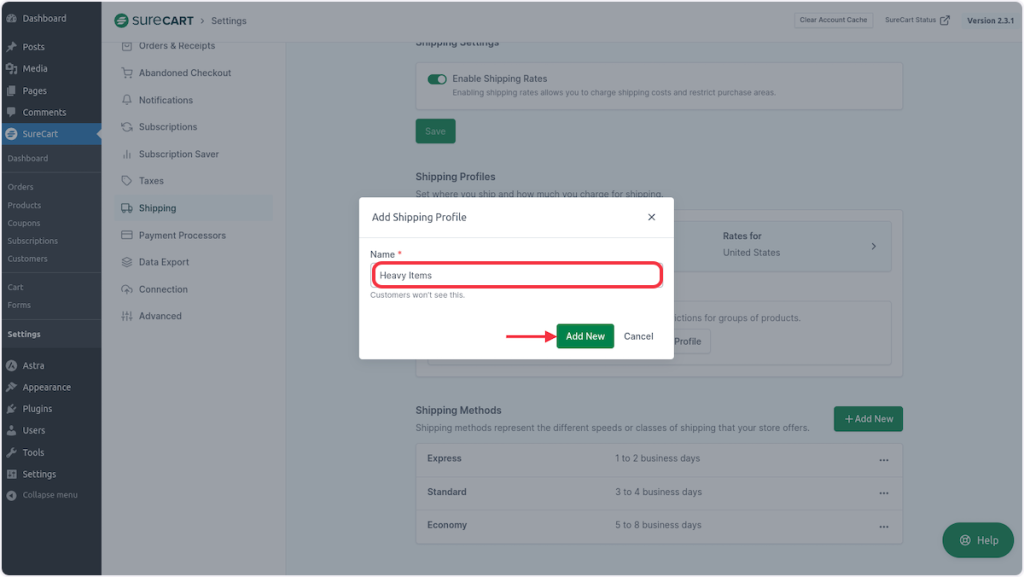 In this step-by-step guide, we will walk you through the process of configuring a shipping profile. We’ll understand how to create a shipping profile with the help of an example from the above scenario. Let’s say, you have a furniture store and you want to create a new profile for specific items using SureCart’s intuitive interface.
