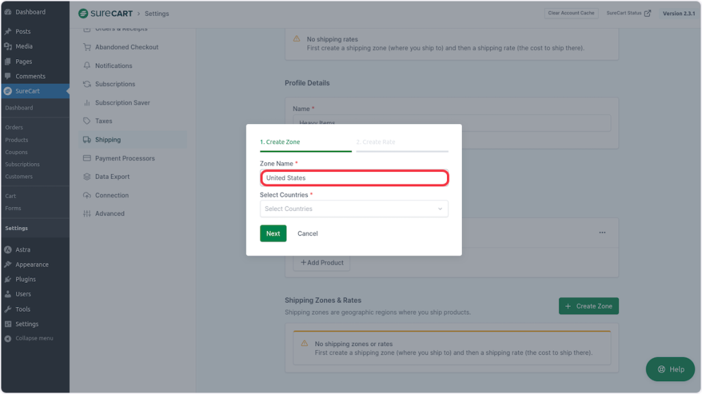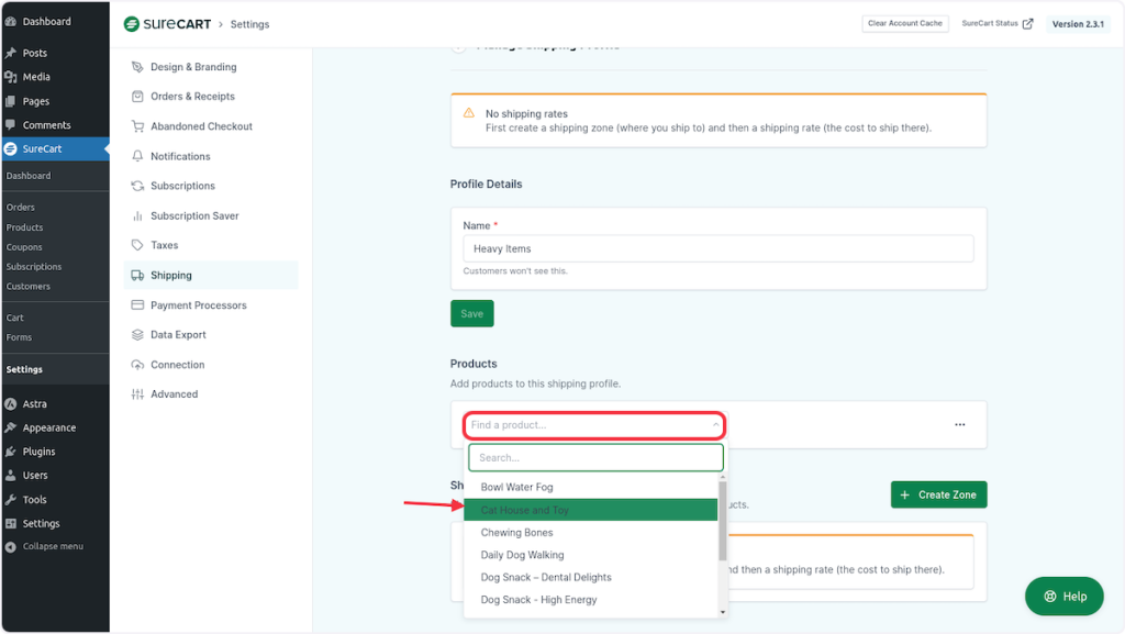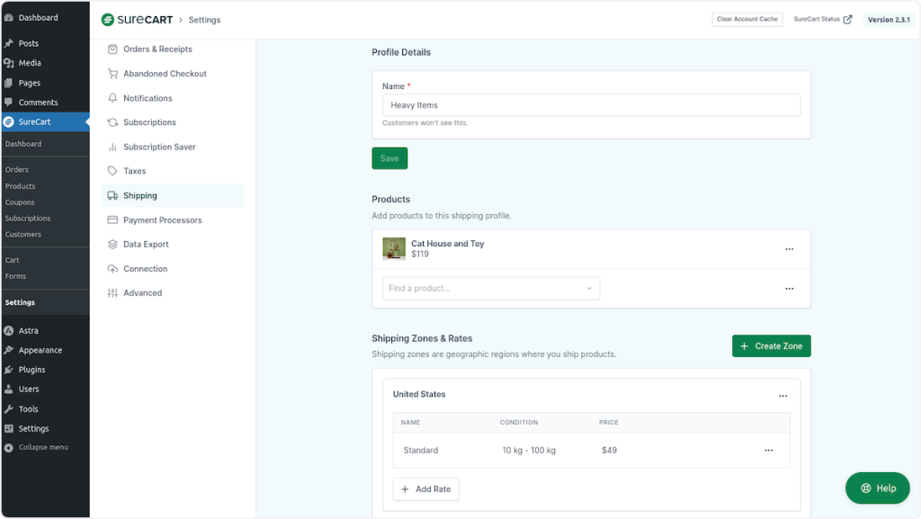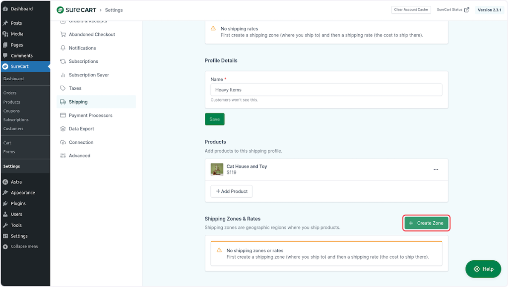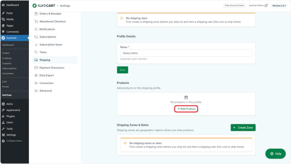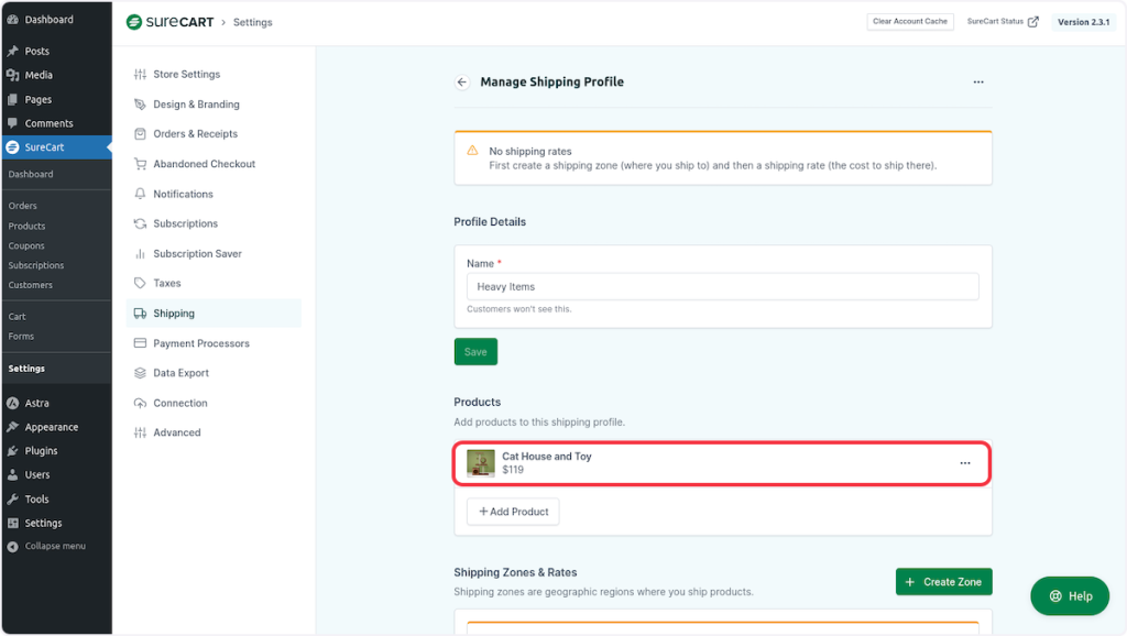 When you set up a shipping profile, you can specify the products you want to include, the shipping zones you want to cover, and the shipping methods you want to offer for those products. We explained this process in detail in the article “Managing Shipping Zones, Methods & Rates in SureCart.“
