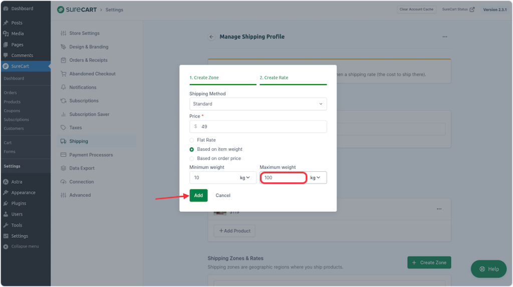 - Now, set the maximum weight of the product for this shipping to be applied, and then click on the “Add” button to save your changes.