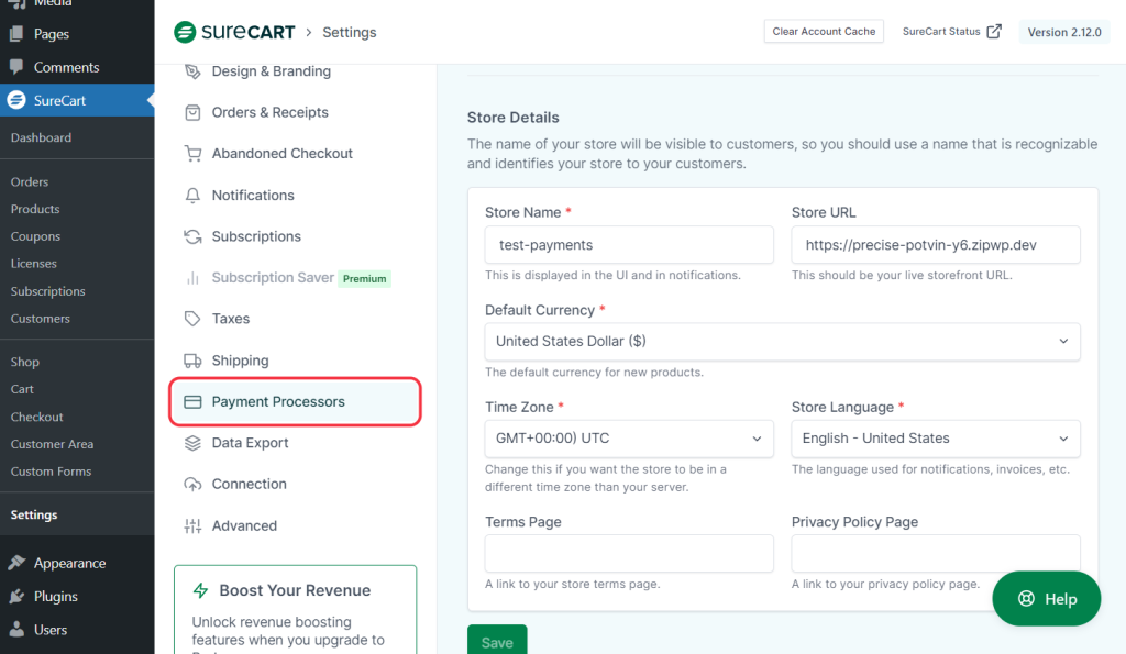 - To do this, navigate to SureCart Settings, then proceed to Payment Processors. Once there, choose the previously used payment processor—Stripe, in our case.