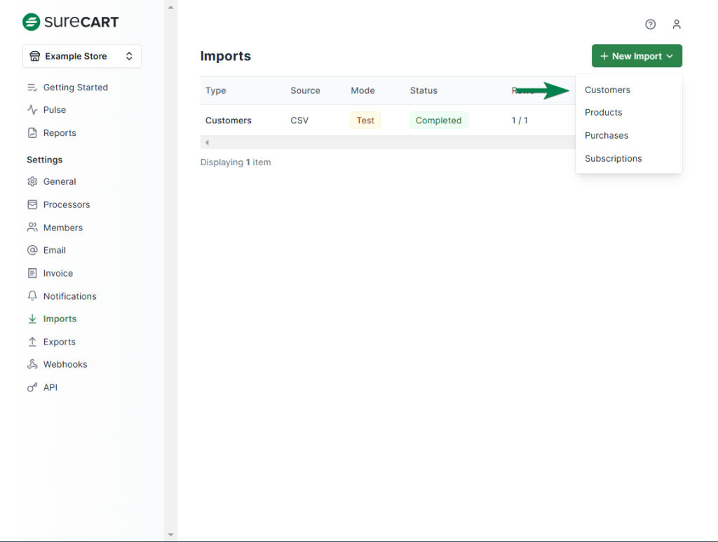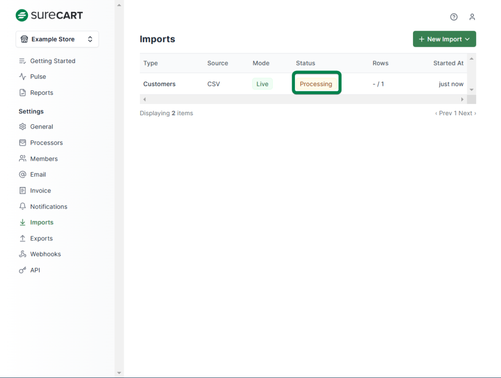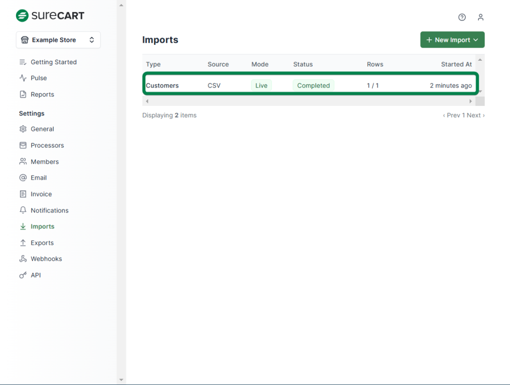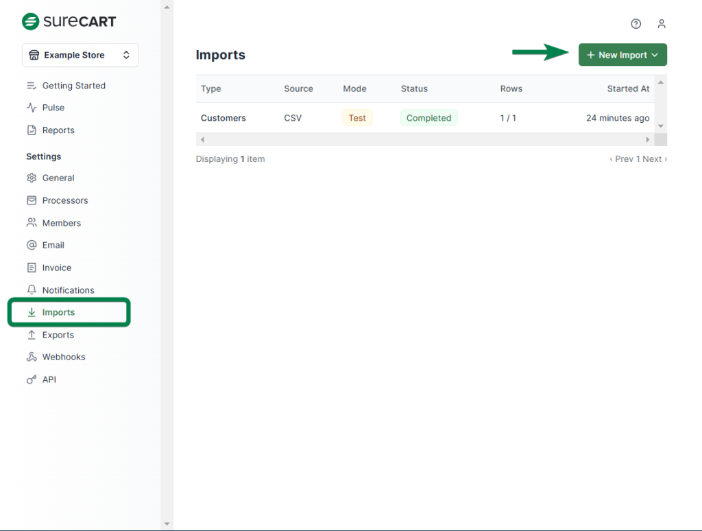 - Login to the SureCart platform and navigate to Imports. Click on the New Import button.