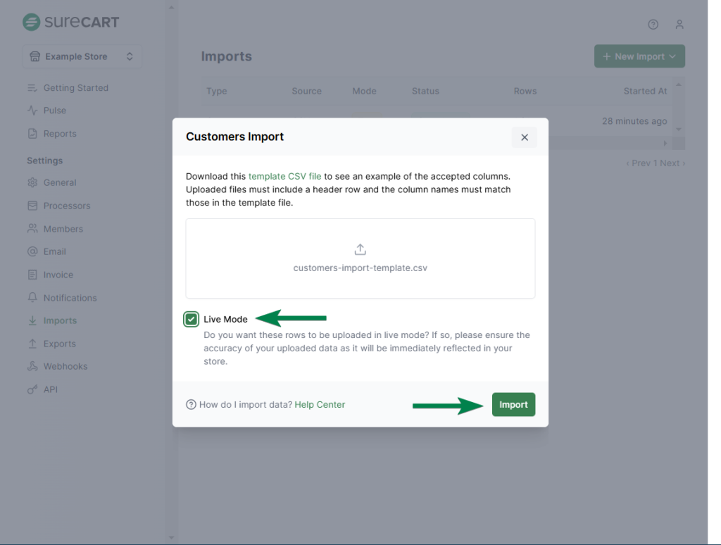 If the toggle is turned off, the data will be imported in test mode. Then, click on the Import button to begin the importing process.