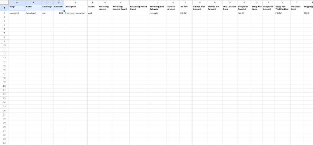 Please note: The required fields are the ones that contain an asterisk (*) next to the header. In the above example, the required fields are Slug, Name, Currency, and Amount. If you don’t fill the required fields, importing will not be successful.