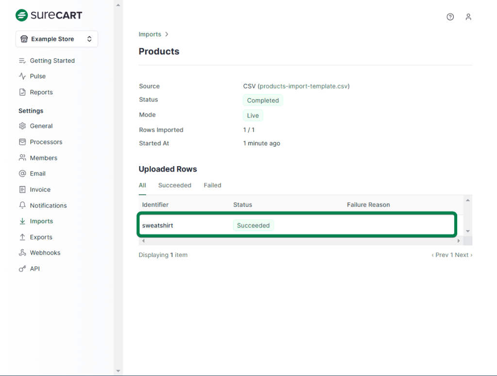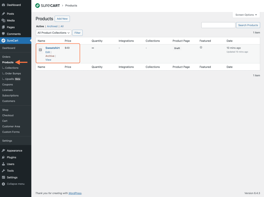 - Once you’ve imported your products, you’ll find them in the Products menu of your SureCart dashboard. To see and manage these newly added products, simply click on any of them.