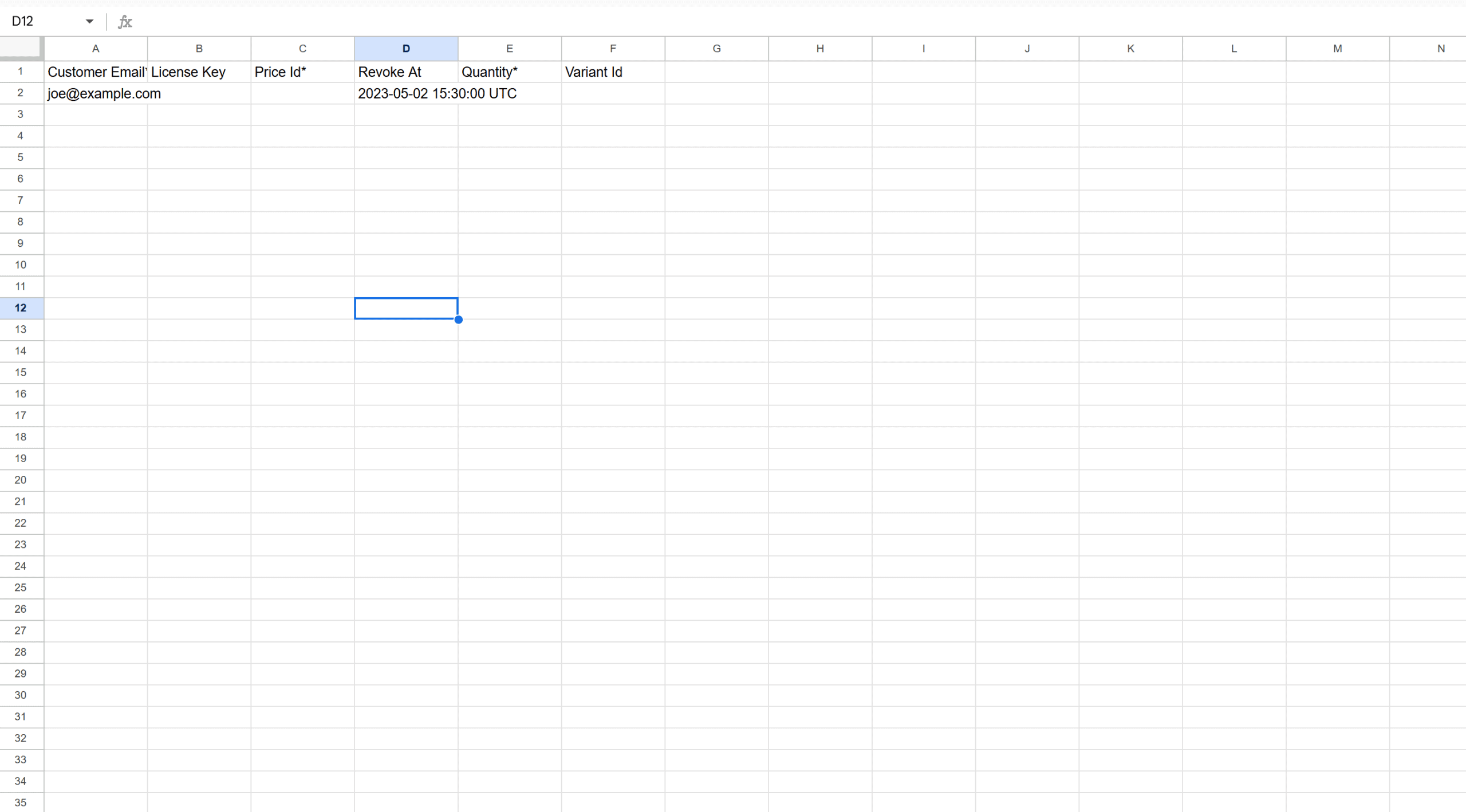 Note: Some fields in the template have an asterisk (*) next to them, indicating they’re essential. In your case, the necessary fields are – Customer Email, Price ID, and Quantity.