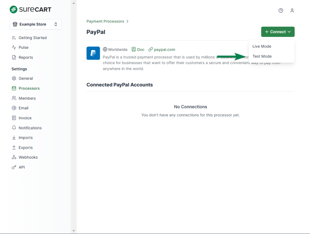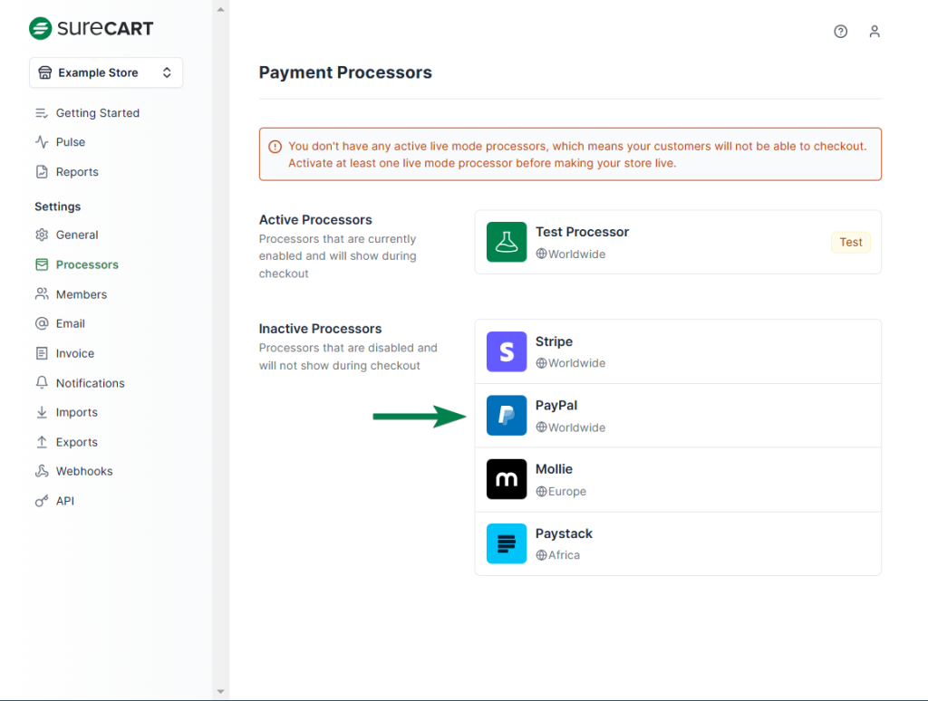 - On the Processors page on the SureCart App Dashboard, click PayPal