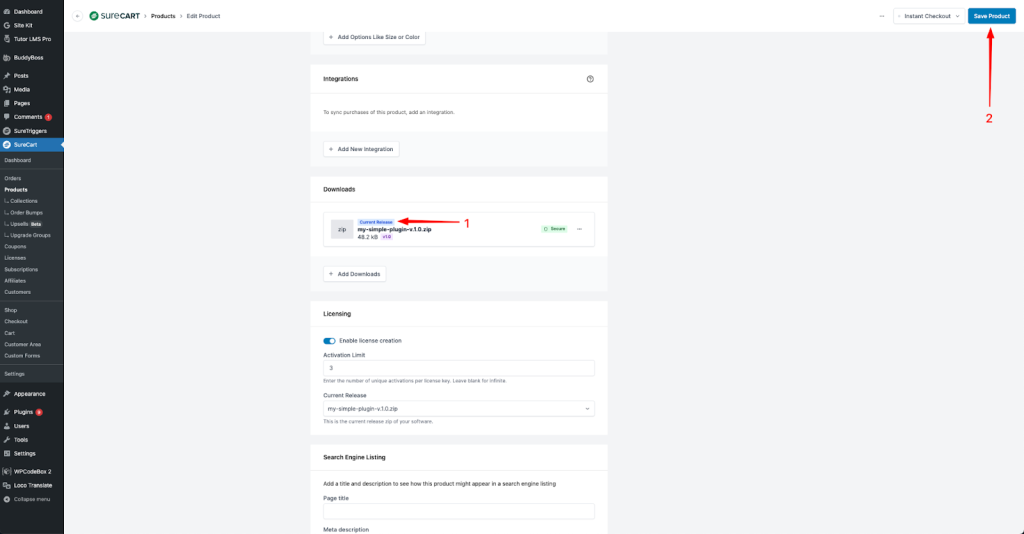 - Now, compress your plugin, upload it to your product, set this file as the Current Release, and click on the “Save Product” button.