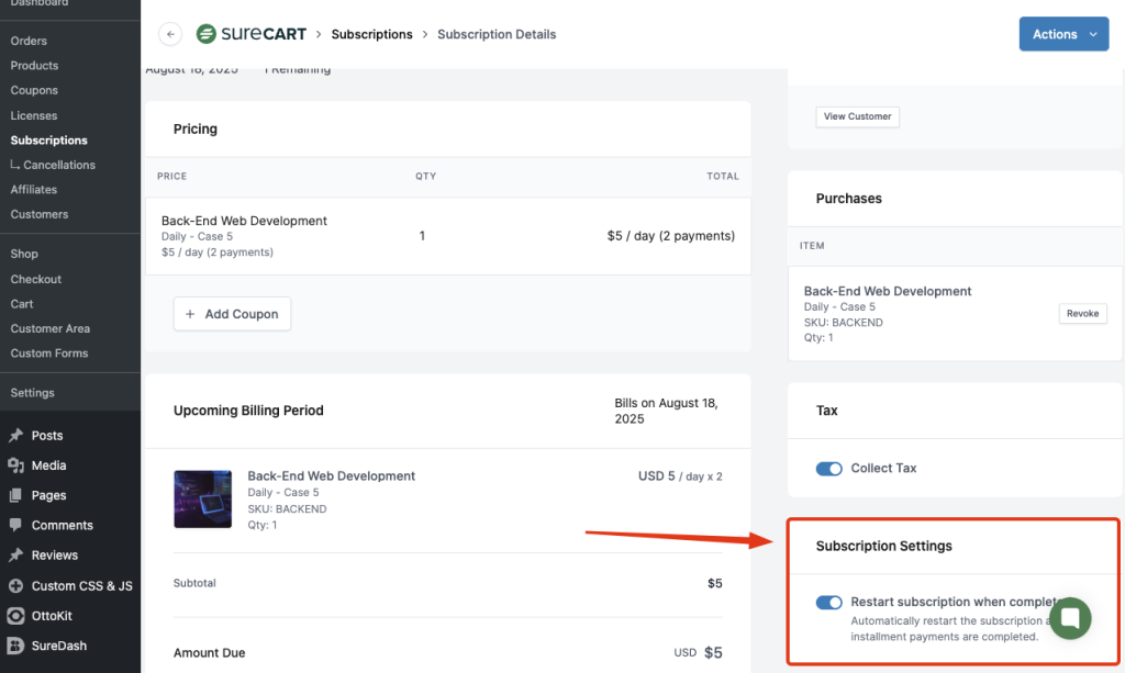 There may be situations where you want to change your customer’s renewal date for a particular subscription. SureCart has a feature that allows you to change the subscription renewal date.