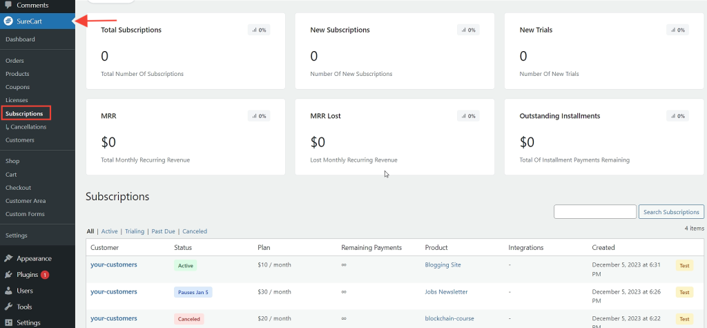 - Navigate to the SureCart plugin, and click on Subscriptions.