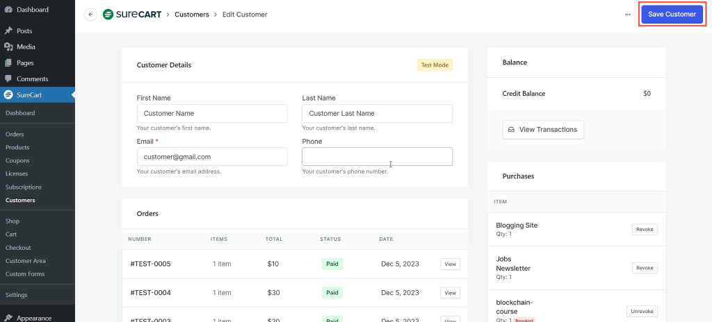 You can also edit the individual customer details in SureCart. Click on the View Customer button in your Subscription details dashboard: