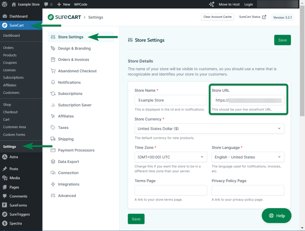 Step 1: Log in to WordPress Dashboard and navigate to SureCart > Settings > Store Settings. Ensure that the store URL is correctly mapped.