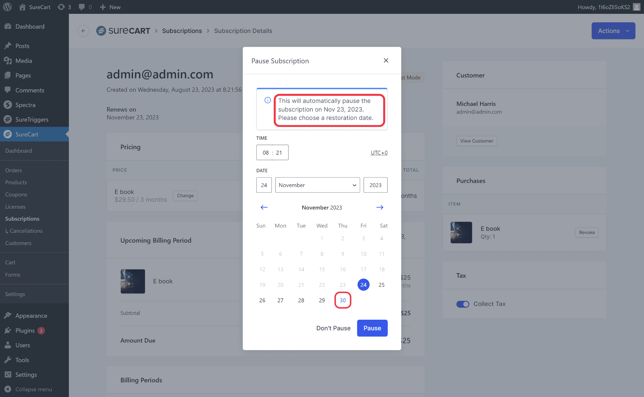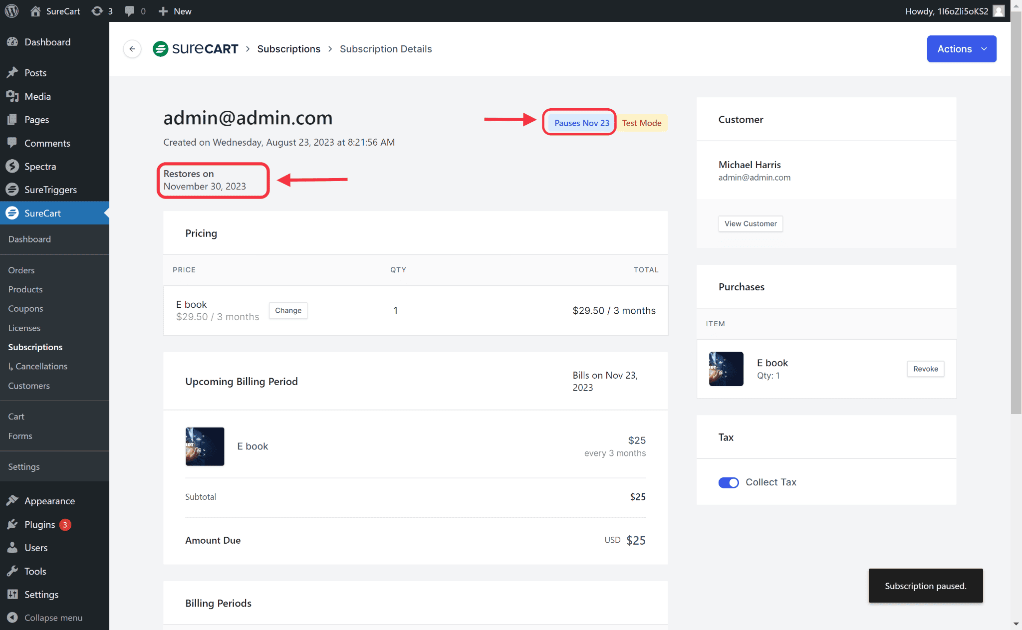 With SureCart, you can easily change your customer’s subscriptions by changing renewal dates, pausing subscriptions, canceling and even restoring a canceled subscription.