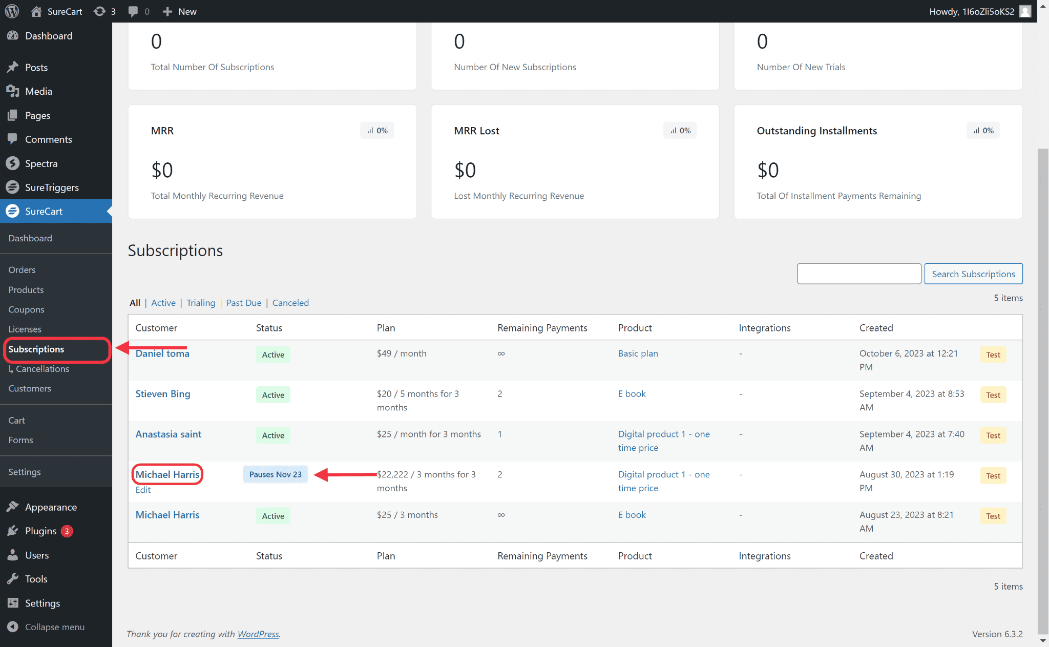 - Go to the SureCart menu > Subscriptions, and then select the customer whose subscriptions you want to pause