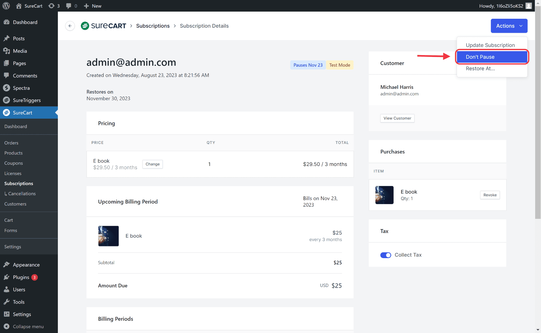 - In the right corner of the screen, click on the “Actions” button, then select “Pause Subscription”.