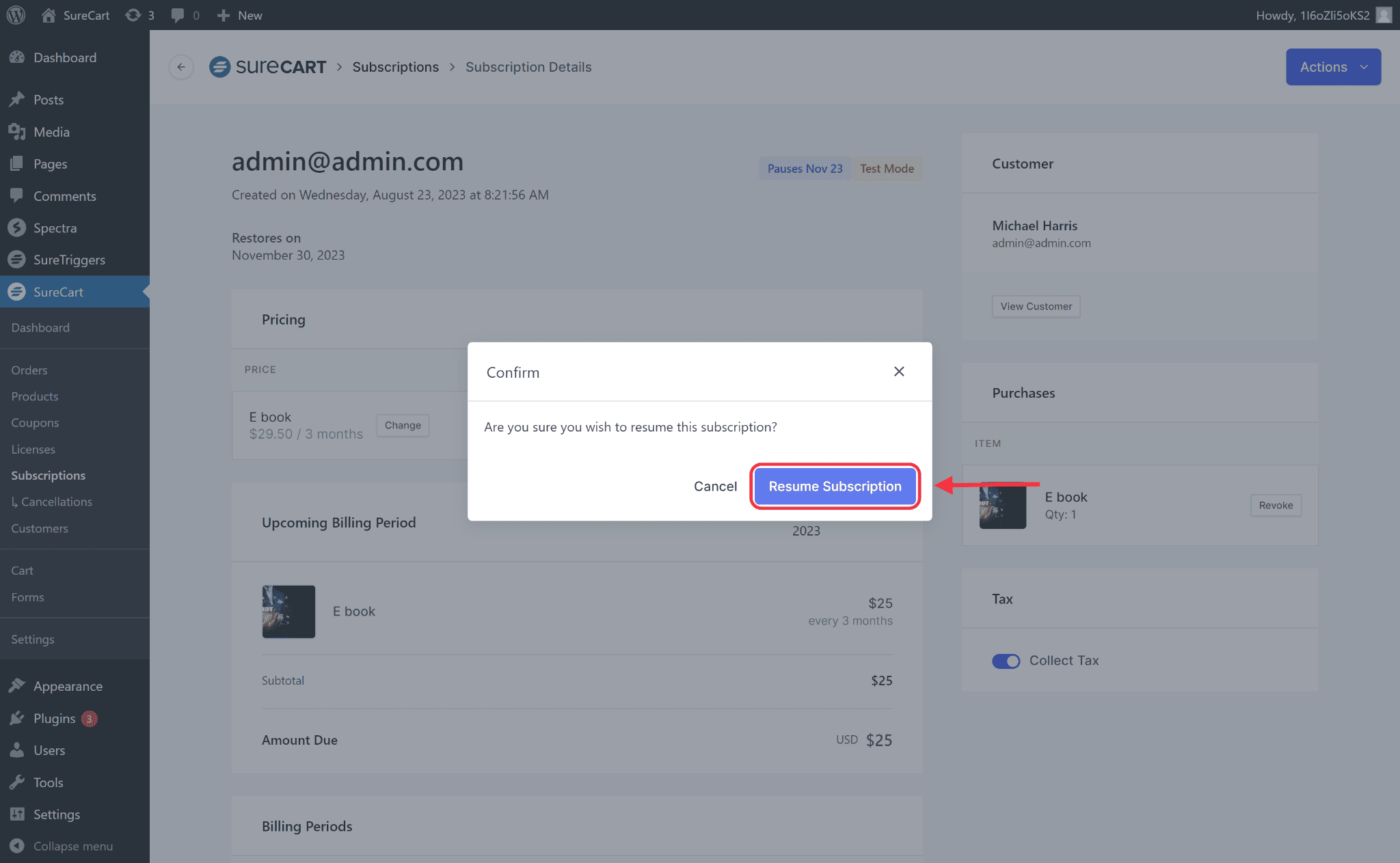 - Go to the SureCart menu > Subscriptions and then select the paused subscription that you want to resume.