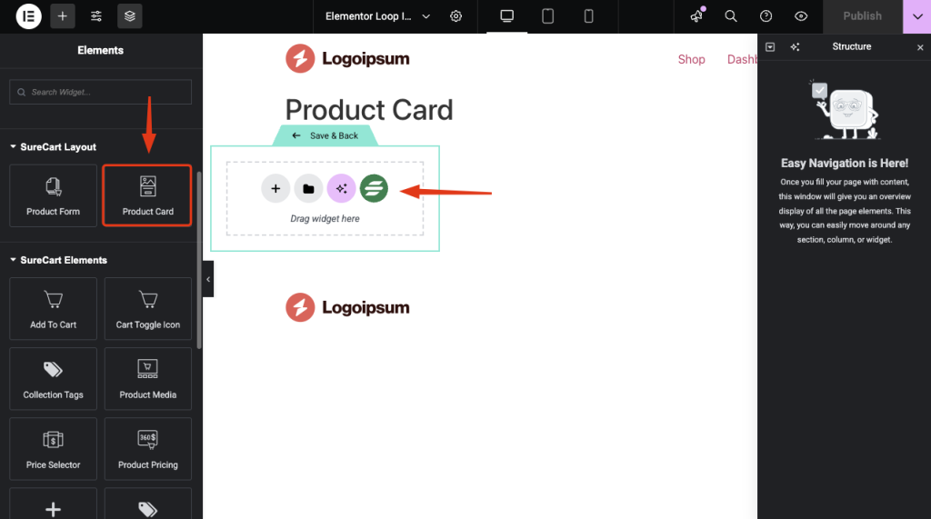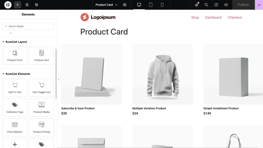 This guide explains how to use the SureCart Product Card within Elementor. This functionality is especially useful if you want to create a custom shop page or display individual products on any page or post.