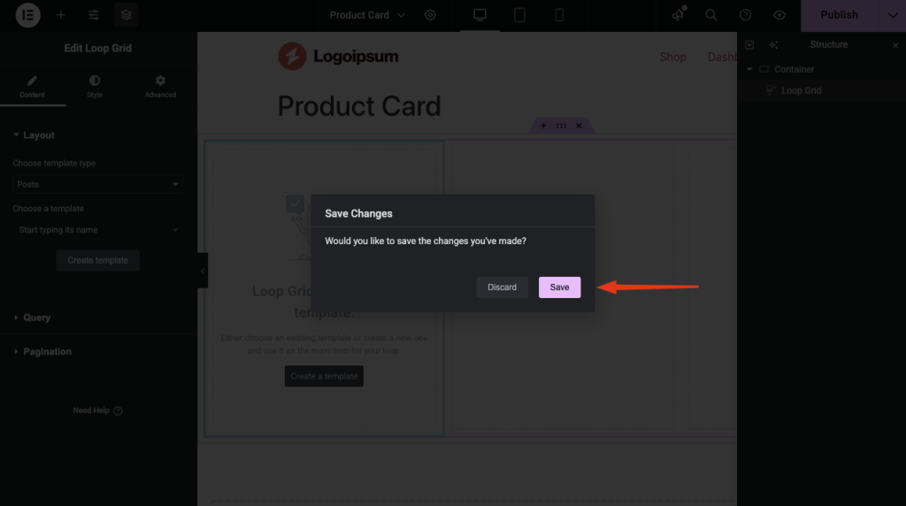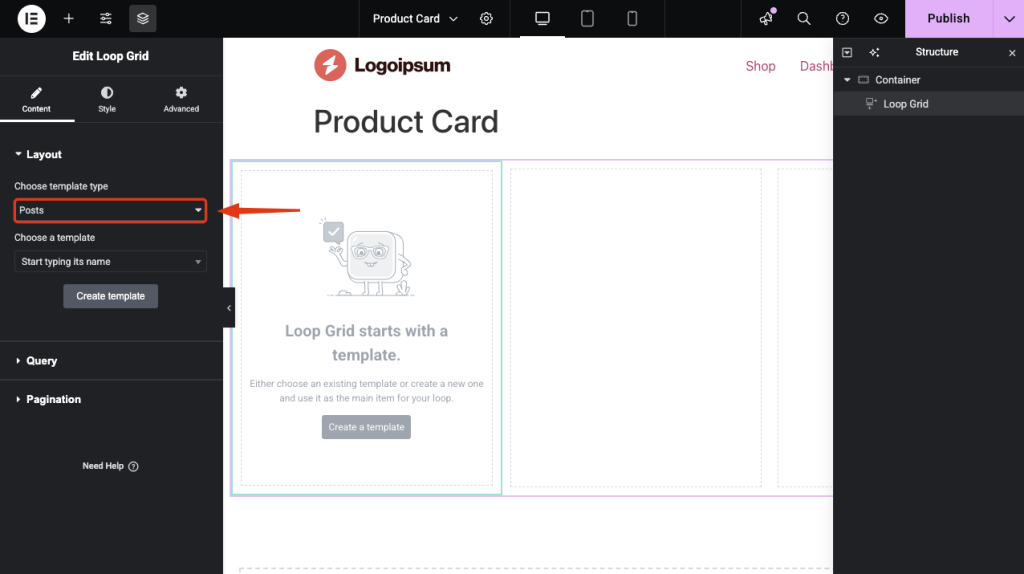 - First, create a page or post and edit it with Elementor. Once you are inside Elementor, add a container and then add the Loop Grid inside it.