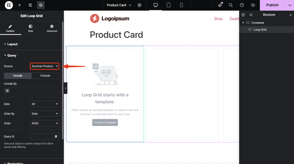 In order to use the SureCart Product Card element, you need to use it inside an Elementor Loop Grid. You can do this on any page or post, so it’s very handy.