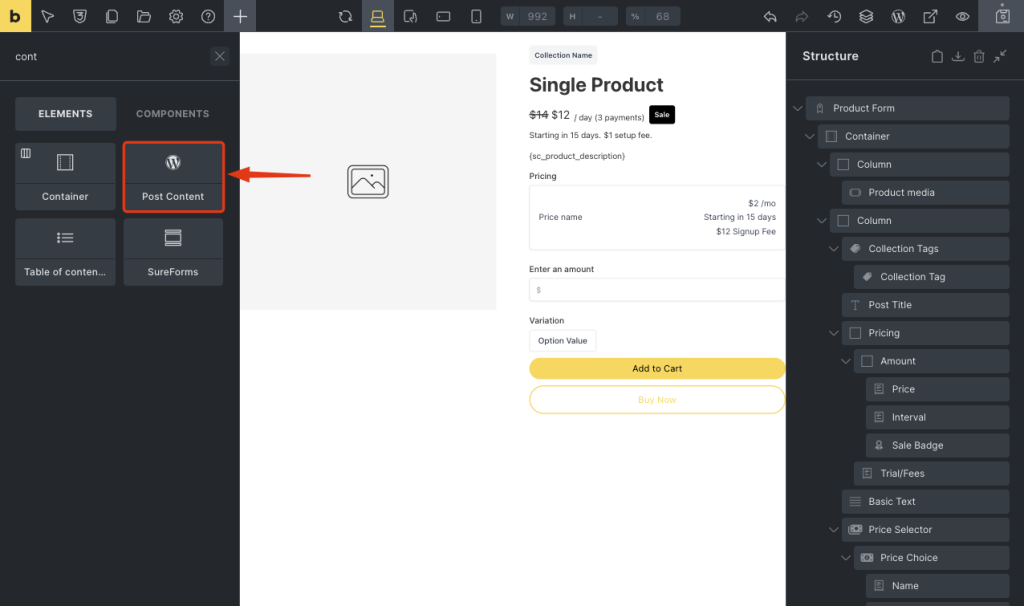- Once you’re in the Bricks editor, insert the Post Content element into the desired section of your template.