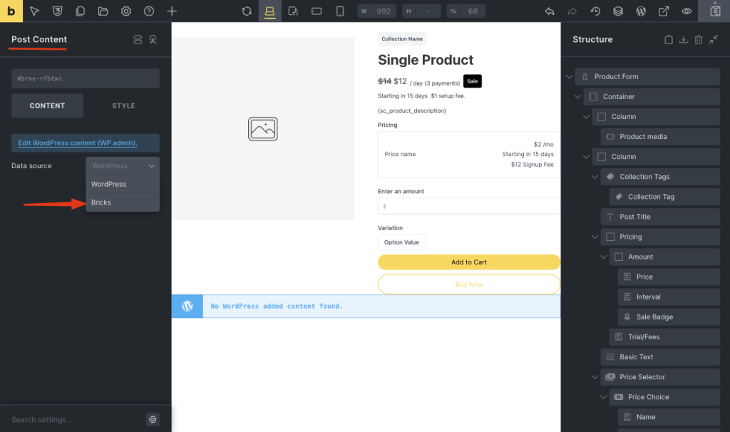 - In the Data source, select Bricks and now you content will automatically be added to your product.