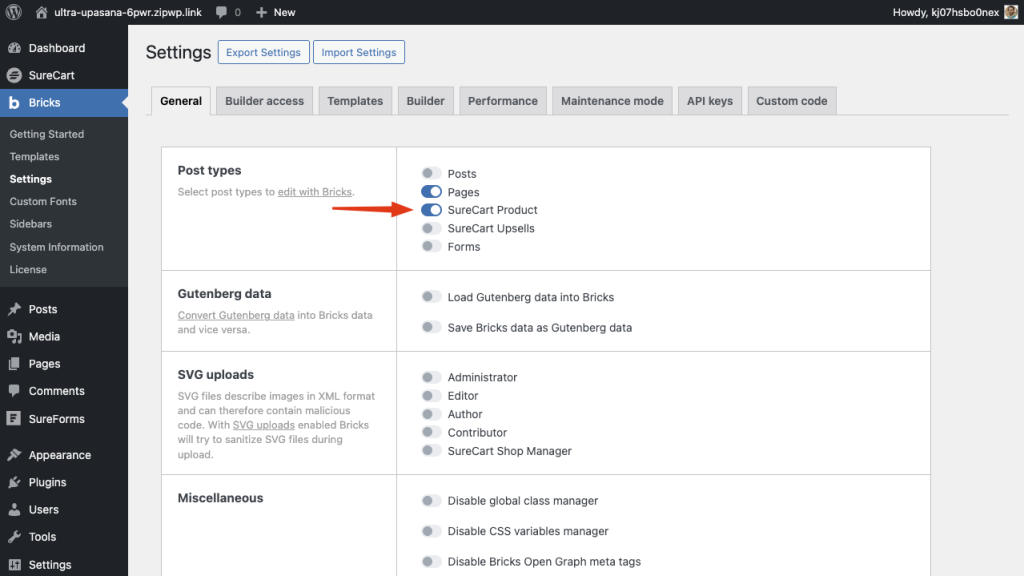 - First, you need to enable the SureCart Product Post Type in Bricks. To do this, go to Bircks > Settings and under Post Types, enable SureCart Product and Save Settings.