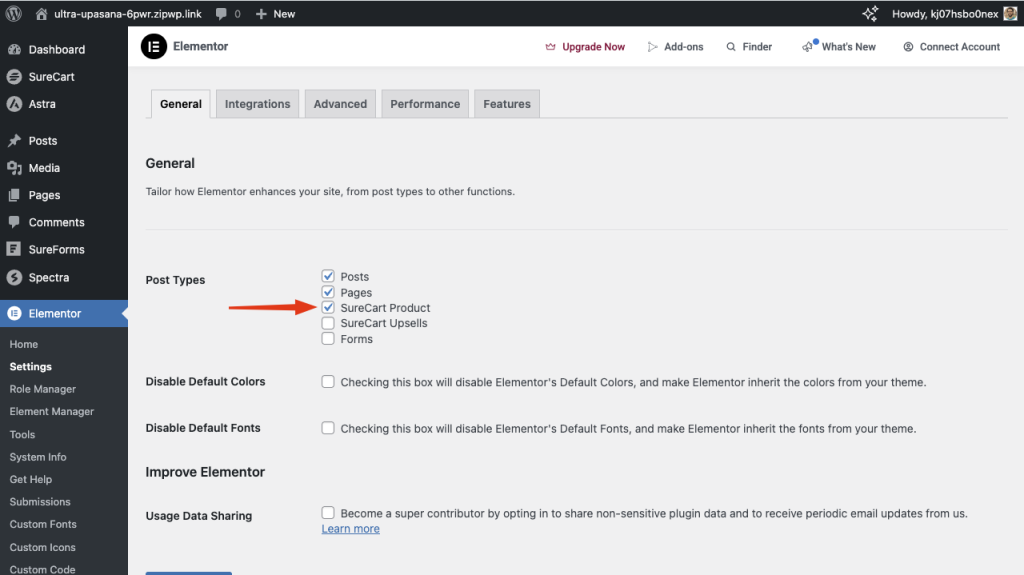 - First, you need to enable the SureCart Product Post Type in Elementor. To do this, go to Elementor > Settings and under Post Types, check the box for SureCart Product.