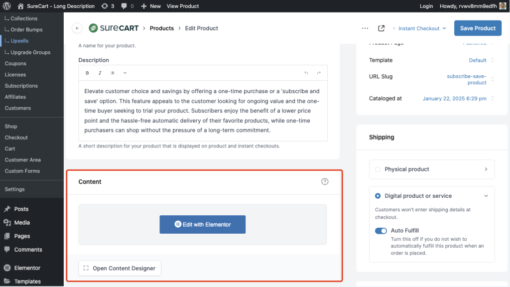 Elementor allows you to design and customize product description pages seamlessly with SureCart. Using its intuitive drag-and-drop editor, you can build unique, visually engaging product description layouts tailored to your store’s needs, all within the product page. You have full creative control and can easily add text, images, and other design elements to enhance your product descriptions and drive customer engagement.
